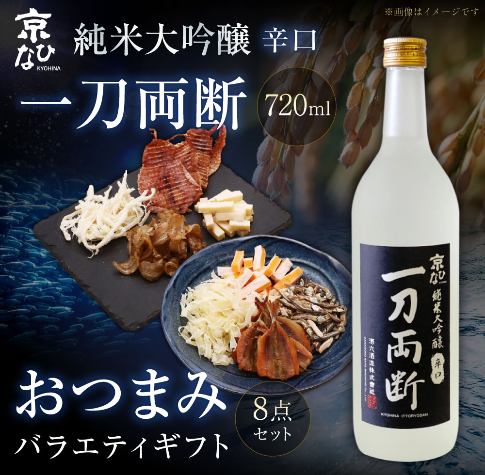 - 【ふるさと納税】京ひな 一刀両断純米大吟醸辛口 720ml おつまみセット(バラエティギフト8点セット) アーモンド小魚 するめ 小いわし 焼きあじ さきいか レッドチェダー チーズプレーン トリュフチーズ 酒 【えひめの町(超)推し!(内子町)】 愛媛県 送料無料 (600)