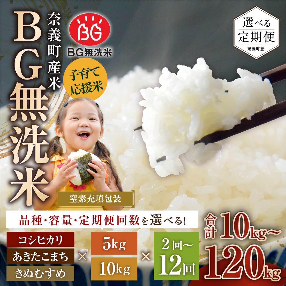 - 【ふるさと納税】<選べる品種・内容量・定期便回数>子育て応援米 奈義町産米 BG無洗米 あきたこまち / きぬむすめ / コシヒカリ 1回あたり5kg / 10kg【窒素充填包装】 1ヶ月毎 2回~12回 お米 米 こめ 無洗米 単一原料米 ごはん ご飯 定期便 国産 岡山県産 奈義町 送料無料