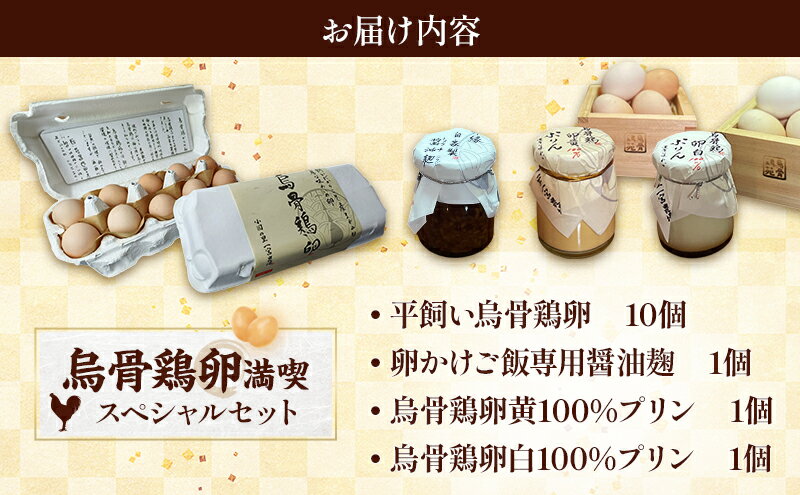 - 【ふるさと納税】【烏骨鶏卵満喫スペシャルセット】平飼い烏骨鶏卵、卵かけご飯専用醤油麹、烏骨鶏卵黄100%プリン、卵白100%プリン たまご 生卵 タマゴ うこっけい 平飼い 醤油麹 プリン 森町 静岡県