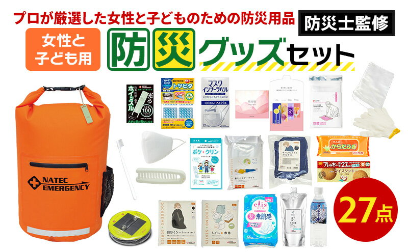 - 【ふるさと納税】防災士監修 防災グッズ 女性と子ども用 セット 27点 防水 多機能リュック 20L 携帯トイレ 清潔用品 ランタン 生理用品 メイク落とし ヘアブラシ 圧縮袋 クッキー 非常用持ち出し袋 防災 防災用品 災害 非常用 ナテック 送料無料 愛知県 あま市