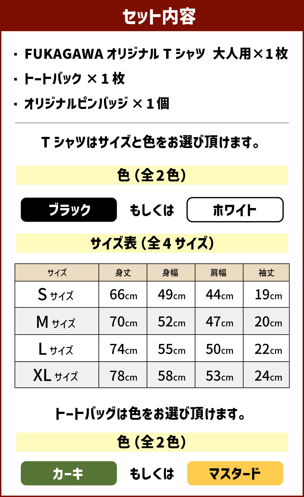 - 【ふるさと納税】FUKAGAWA オリジナルTシャツ ホワイト/ブラック(大人用)・トートバッグ・オリジナル ピンバッチ セット Tシャツ S~XL トートバッグ カーキ マスタード 米BOYくん そば犬みのる 公式キャラクター キャラクター プリント 半袖