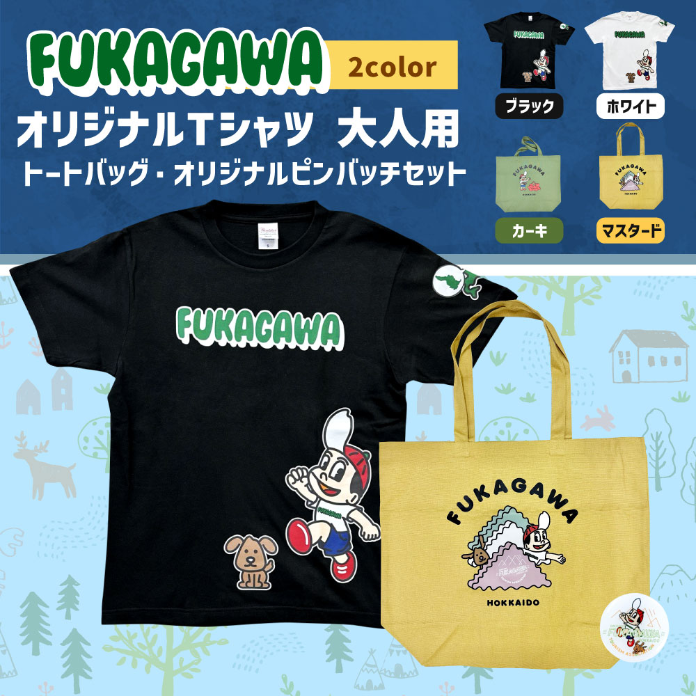 【ふるさと納税】FUKAGAWA オリジナルTシャツ ホワイト/ブラック(大人用)・トートバッグ・オリジナル ピンバッチ セット Tシャツ S~XL トートバッグ カーキ マスタード 米BOYくん そば犬みのる 公式キャラクター キャラクター プリント 半袖