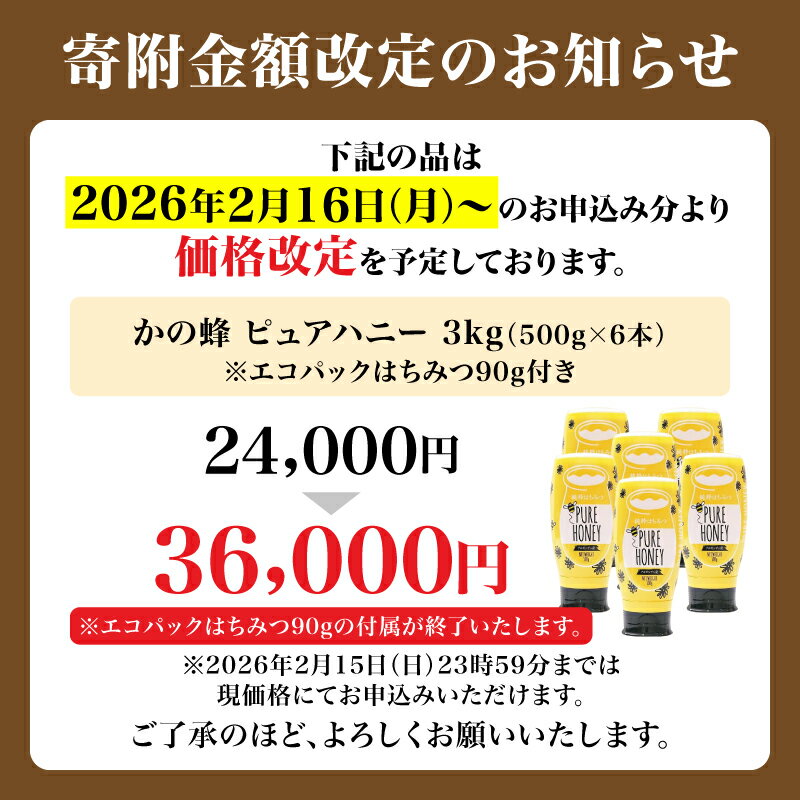 【ふるさと納税】かの蜂 ピュアハニー【AR】3kg(500g×6本) 純粋はちみつ はちみつ ハチミツ 蜂蜜 ワンタッチボトル 保存食 防災グッズ