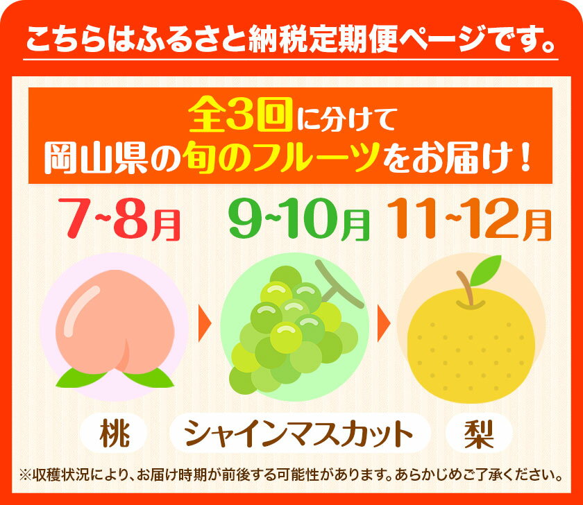 - 【ふるさと納税】岡山県 旬のフルーツ定期便 全3回 桃 約1.3kg シャインマスカット 約1.3kg 旬の梨 約1.8kg (2〜5玉前後) 《7月上旬〜12月末頃に順次発送》優品 フルーツ 果物 ご家庭用 定期便 お取り寄せ デザート 果物 梨 シャインマスカット 桃 ぶどう 白桃 あたご梨