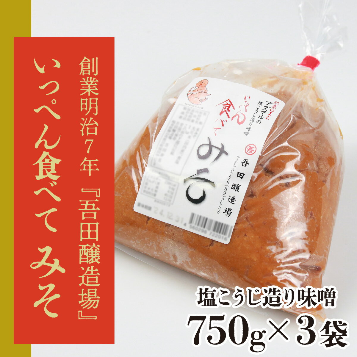 - 【ふるさと納税】味噌 みそ 塩こうじ造り 酒精不使用・食品添加物不使用 米こうじ味噌 750g×3袋 福井県奥越・勝山 吾田醸造場 いっぺん食べてみそ