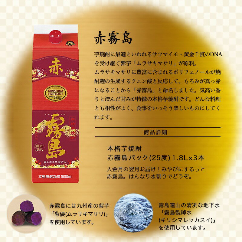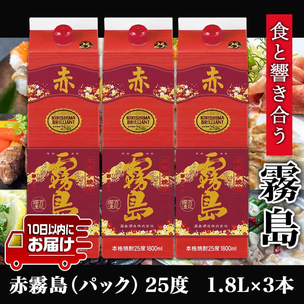 【ふるさと納税】【霧島酒造】赤霧島パック(25度)1.8L×3本 ≪みやこんじょ特急便≫ - フルーティー 本格芋焼酎 1.8L 3本 パック お湯割り/水割り/ストレート/オン・ザ・ロック 定番焼酎 送料無料 21-0724_99【宮崎県都城市は2年連続ふるさと納税日本一!】