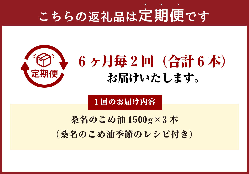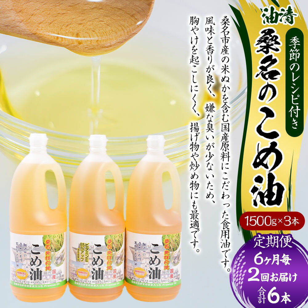 - 【ふるさと納税】【6ヶ月毎定期便2回】油清 桑名のこめ油 1回あたり計4.5kg(1.5kg×3本入り) 桑名のこめ油季節のレシピ付き 米油 油 あぶら 米ぬか ビタミンE 食用油 調味料 揚げ物 炒め物 保健機能食品 健康 国産 三重県 桑名市 送料無料