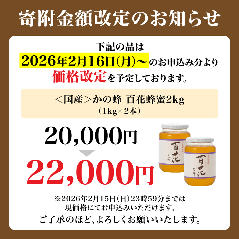 <国産>かの蜂 百花蜂蜜2kg(1kg×2本)養蜂一筋60年自慢の一品 ハチミツ 非加熱 ハニー 大容量 瓶タイプ 保存食 防災グッズ 非常食 ボトル