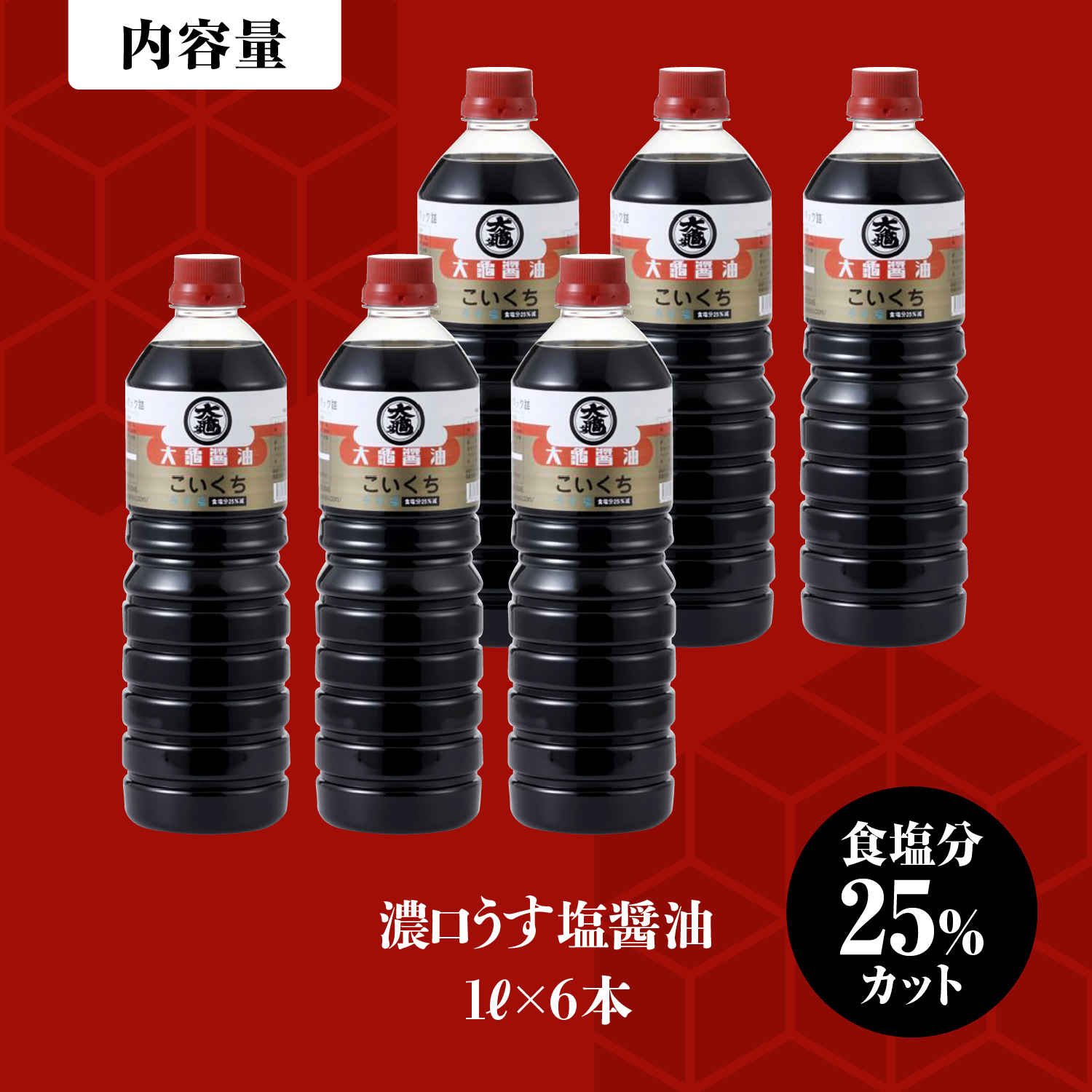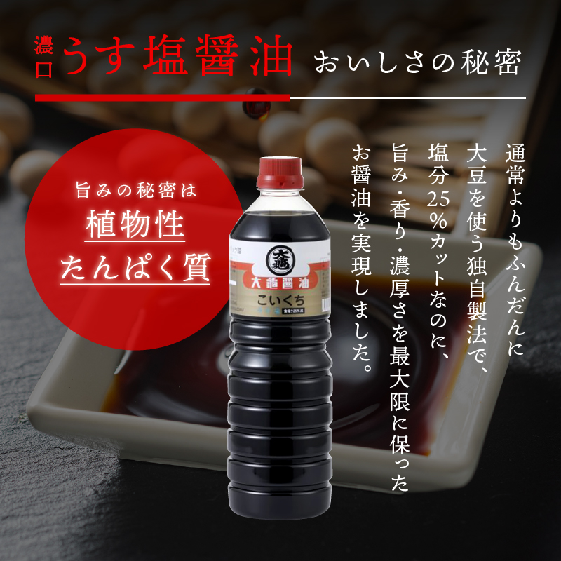 - 大亀醤油 濃口うす塩 1L×6本セット【YS-1】|送料無料 大亀醤油 国産 醤油 しょうゆ しょう油 うす塩タイプ 甘口 旨味 濃口 減塩 減塩25% うす塩 調味料 加工品 料理 調理 食べ物 食品 常温 常温保存 保存 卵かけご飯 色々な料理に ギフト プレゼント|