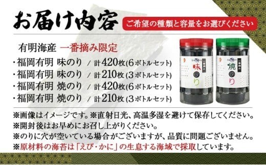 <選べる味と内容量>【有明海産一番摘み限定】福岡有明のり(味のり/焼のり)計210枚/計420枚(10切70枚×3本/10切70枚×6本)sm016-019