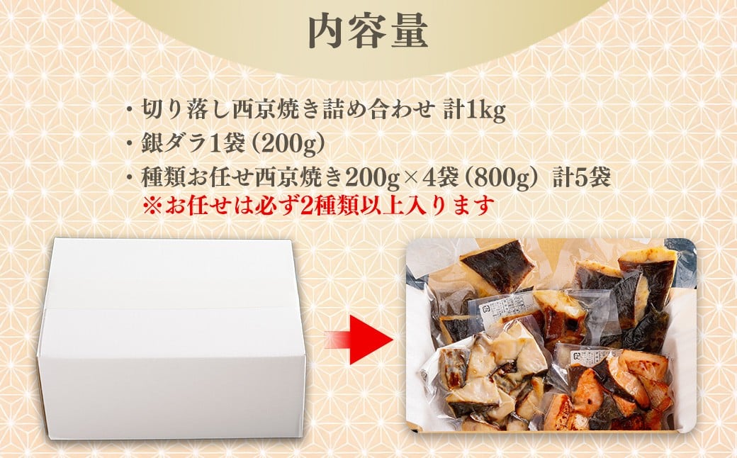【訳あり】切り落とし西京焼詰め合わせ1kg / 銀ダラ1袋(200g)+種類お任せ西京焼き200g×4袋(800g)計5袋 ※お任せは必ず2種類以上入ります ふるさと納税 西京焼き 銀ダラ 魚惣菜 詰め合わせ 焼魚 ご当地グルメ おつまみ おかず お取り寄せグルメ おすすめ 惣菜 お惣菜 食品 加工食品 加工品 千葉県 香取市 KTRCL002