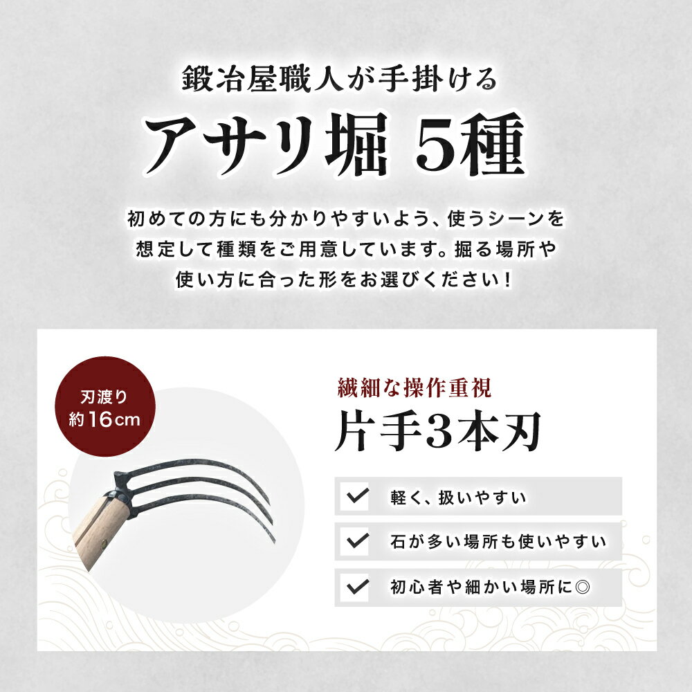 【ふるさと納税】選べる刃数・仕様! 石原用 アサリ掘 片手/両手(3・4・5・6・8本曲刃)| アサリ堀 潮干狩り 道具 原石用 貝取り 貝堀 レジャー 熊手 くまで レーキ 日本製 大分県産 九州産 中津市