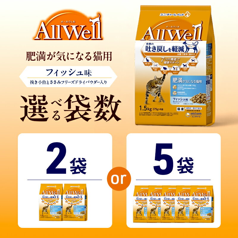 【ふるさと納税】AllWell 肥満が気になる猫用 フィッシュ味 挽き小魚とささみフリーズドライパウダー入り 1.5kg 選べる袋数(2袋/5袋) ペットフード キャットフード 猫のごはん 猫用フード 猫 ペット ドライ ユニ・チャーム ペット