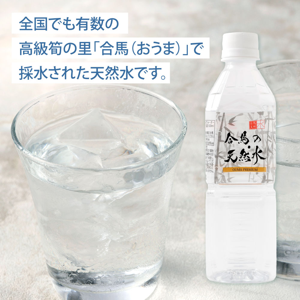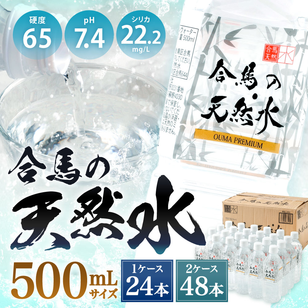 - 【ふるさと納税】合馬の天然水 500mL 選べる 1ケース(24本セット) または 2ケース(48本セット) 水 鉱水 ペットボトル 天然水 ミネラル 軟水 シリカ サルフェート お水 備蓄 備え 災害 飲用水 福岡県北九州市