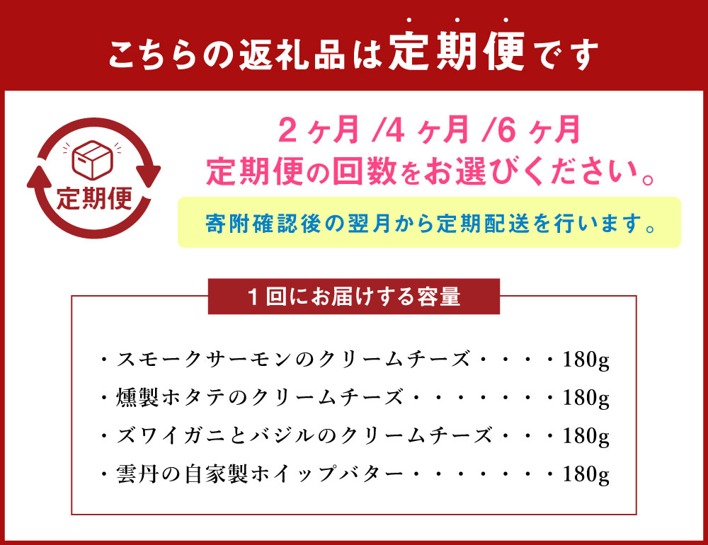 - 【ふるさと納税】定期便 YUKIAKARI特製 小樽の海鮮クリームチーズセット 4種詰め合わせ 各180g 計720g 選べる定期便 2回 4回 6回 / クリームチーズ 海鮮 魚介 海産物 海の幸 スモークサーモン サーモン 帆立 ホタテ ずわい蟹 ズワイガニ 蟹 バジル 雲丹 加工品 食品 冷蔵