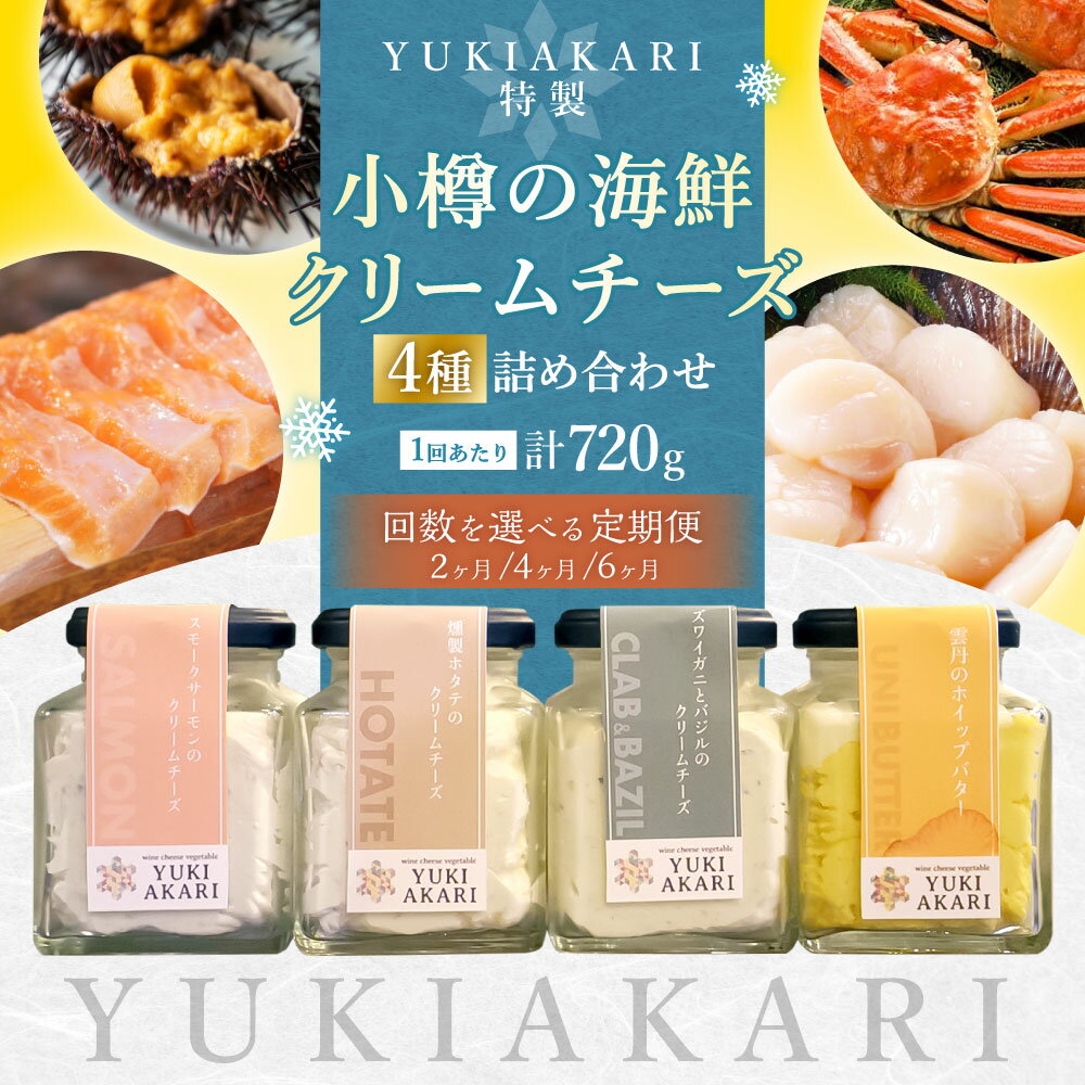 【ふるさと納税】定期便 YUKIAKARI特製 小樽の海鮮クリームチーズセット 4種詰め合わせ 各180g 計720g 選べる定期便 2回 4回 6回 / クリームチーズ 海鮮 魚介 海産物 海の幸 スモークサーモン サーモン 帆立 ホタテ ずわい蟹 ズワイガニ 蟹 バジル 雲丹 加工品 食品 冷蔵