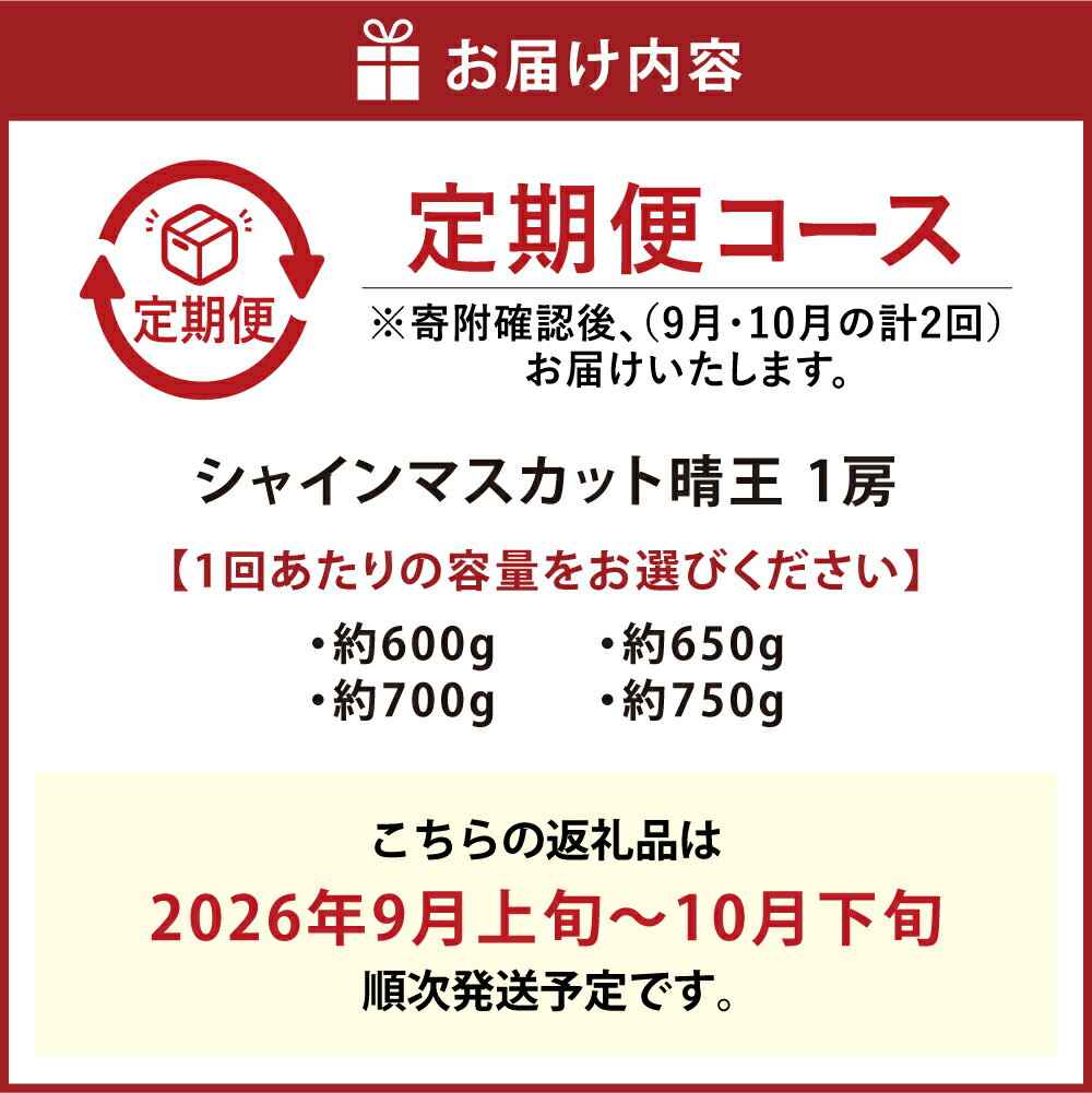 【ふるさと納税】[HS]【2回定期便】シャインマスカット 晴王 <選べる内容量> 1回あたり1房 約600g / 約650g / 約700g / 約750g マスカット ぶどう ブドウ 葡萄 フルーツ くだもの 果物 果実 デザート 冷蔵 国産 岡山県産 倉敷市 送料無料 【2026年9月上旬~10月下旬発送】