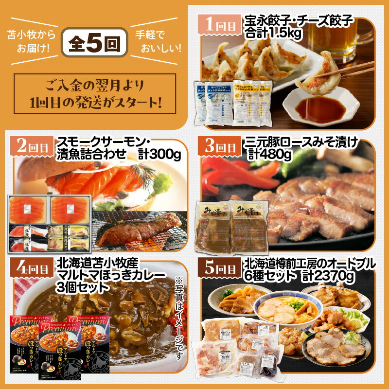 - 【ふるさと納税】<選べる>【 全5回 】 今日のおかずはこれで決まり 食卓 助っ人 定期便 毎月 or 隔月 餃子 チーズ サーモン スモーク 漬魚 魚 豚 肉 味付き 味噌 ほっき カレー カルビ 生姜焼き ザンギ 唐揚げ 北海道 苫小牧市 おすすめ ランキング プレゼント ギフト