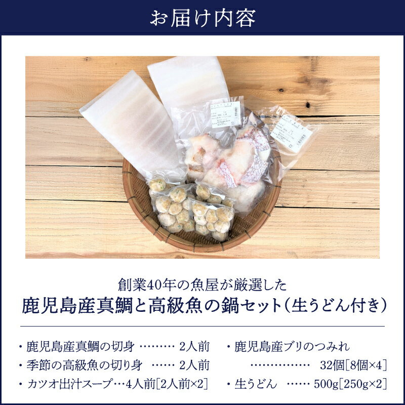 - 【ふるさと納税】昭和49年創業の魚屋が厳選した鹿児島産真鯛と高級魚の鍋セット 生うどん付き 鍋 真鯛 高級魚 ブリ 海産物 魚介 うどん 鍋セット 惣菜 総菜 サカナカケル 鹿児島 鹿屋市 おすすめ ランキング プレゼント ギフト