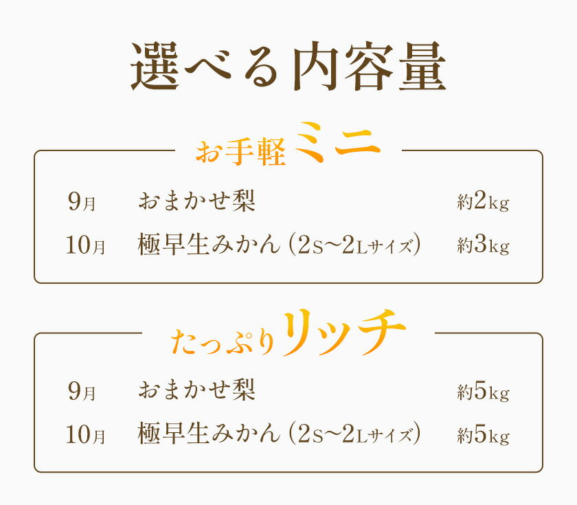 - 【ふるさと納税】旬の フルーツ 定期便 2ヶ月連続 秀品 選べる 内容量 日本フルーツ株式会社《9月上旬-10月末頃出荷》熊本県 荒尾市 おまかせ 梨 極早生みかん 果物 フルーツ スイーツ デザート ギフト ご贈答