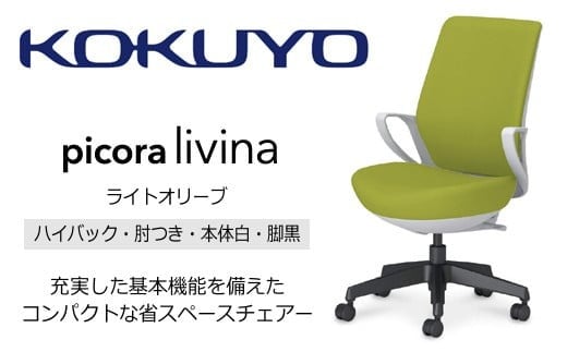コクヨ チェアー ピコラリビナ (ライトオリーブ) C10-B12CG-E1G9Q41 ハイバック・肘付・黒樹脂脚・本体白・布・ゴム単輪キャスター/在宅ワーク・テレワークにお勧めの椅子【136-05】