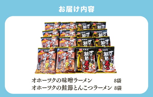 - [№5930-0501]【3ヵ月定期便】オホーツクの味噌ラーメン オホーツクの鮭節とんこつラーメン各8袋 麺類 乾麺 湧別町 北海道