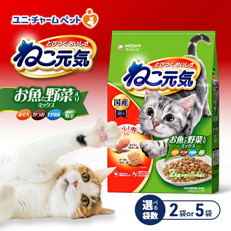 【ふるさと納税】ねこ元気 お魚と野菜入りミックス まぐろ・かつお・白身魚・緑黄色野菜入り 2.0kg 選べる袋数(2袋/5袋) ペットフード キャットフード 猫のごはん 猫用フード 猫 ペット ドライ ユニ・チャーム ペット