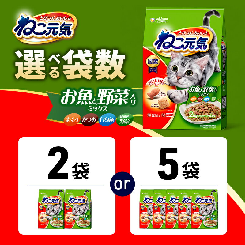 - 【ふるさと納税】ねこ元気 お魚と野菜入りミックス まぐろ・かつお・白身魚・緑黄色野菜入り 2.0kg 選べる袋数(2袋/5袋) ペットフード キャットフード 猫のごはん 猫用フード 猫 ペット ドライ ユニ・チャーム ペット
