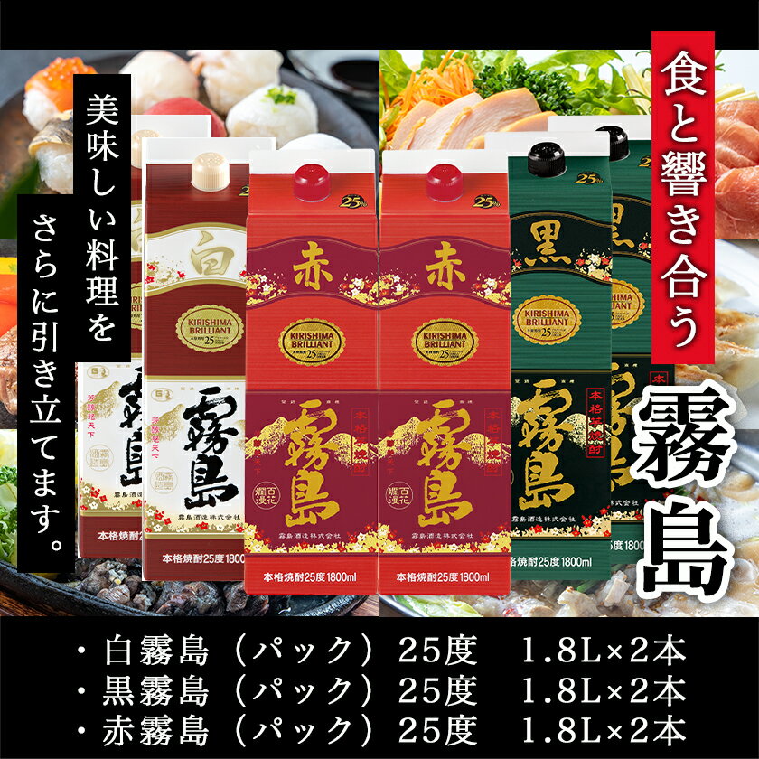- 【ふるさと納税】霧島酒造(赤・黒・白)パック1.8L×6本≪みやこんじょ特急便≫ - 白霧島 黒霧島 赤霧島 25度 1.8L×各2本 紙パック焼酎 いも焼酎 一升パック 1800ml 代表銘柄 お酒 送料無料 33-19-004【宮崎県都城市は2年連続ふるさと納税日本一!】