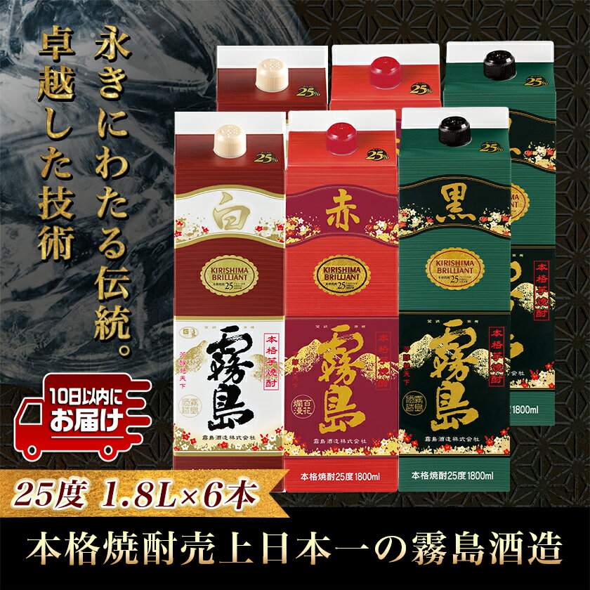 【ふるさと納税】霧島酒造(赤・黒・白)パック1.8L×6本≪みやこんじょ特急便≫ - 白霧島 黒霧島 赤霧島 25度 1.8L×各2本 紙パック焼酎 いも焼酎 一升パック 1800ml 代表銘柄 お酒 送料無料 33-19-004【宮崎県都城市は2年連続ふるさと納税日本一!】