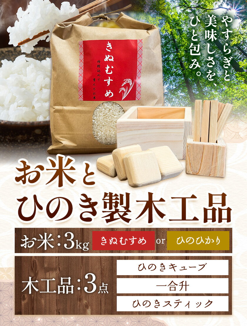 - 【ふるさと納税】 米 3kg ひのき製木工品 3点 セット きぬむすめ ひのひかり おまかせ 米3kg+木工品3点 ひのきキューブ 一合升 ひのきスティック ありがとう園《30日以内に出荷予定(土日祝除く)》岡山県 矢掛町 お米 木工品