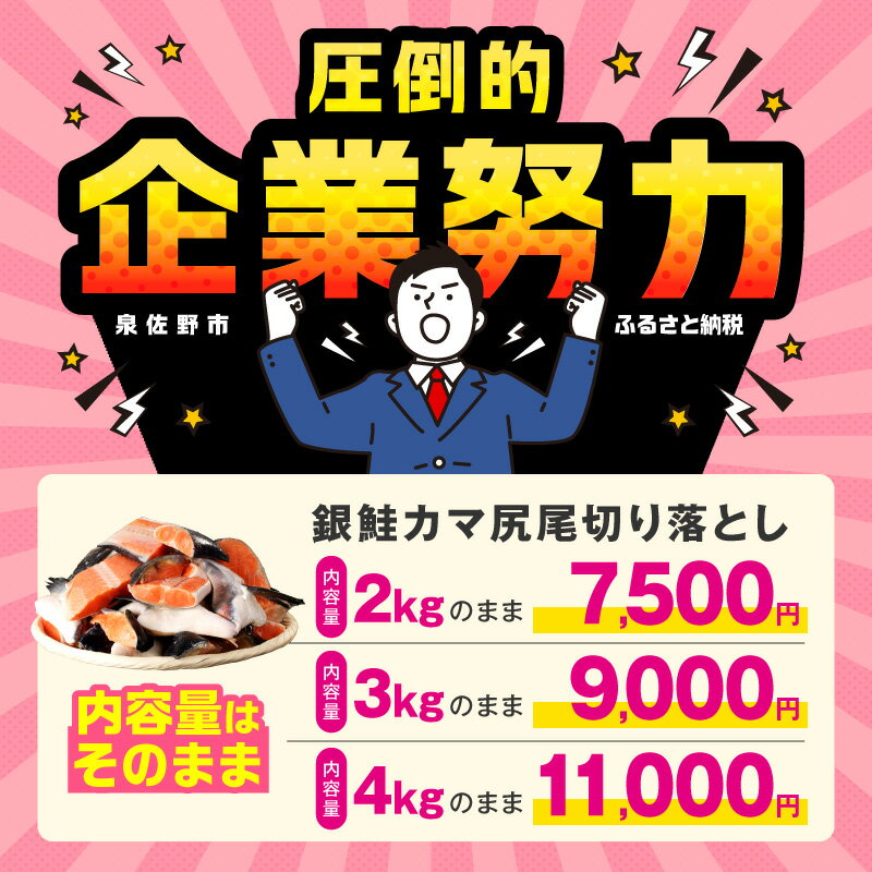 - 【ふるさと納税】【訳あり】 規格外 銀鮭 切り落とし 2kg ~ 4kg カマ 尻尾 小分け 鮭 サーモン 脂のり 切り身 食品 魚 魚介類 海鮮 おかず お弁当 鮭カマのあら汁 塩焼き ご飯のお供 冷凍 簡単調理 お取り寄せ まとめ買い 大阪府 泉佐野市 送料無料 圧倒的企業努力