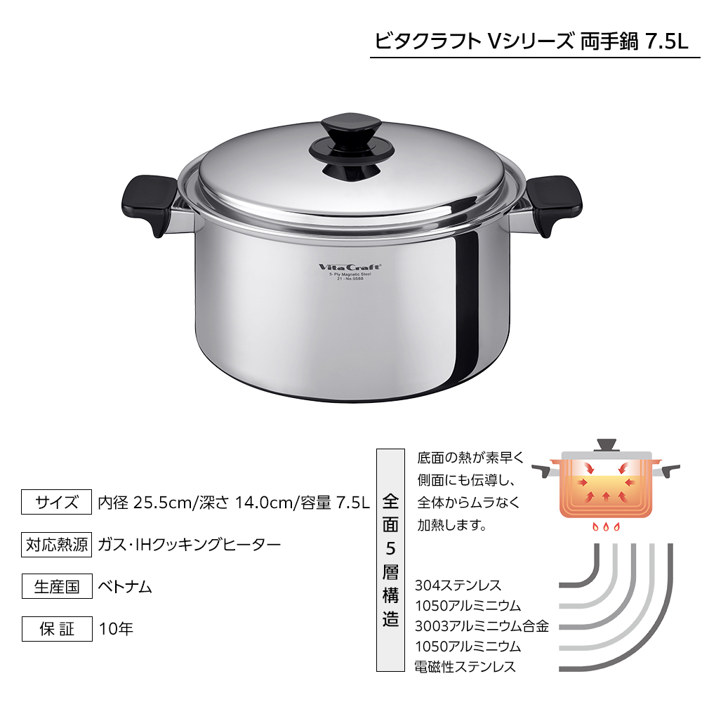 - ビタクラフト 両手鍋 深型 7.5L Vシリーズ ガス・IH対応 熱しやすく 冷めにくい 全面5層構造 長期10年保証 鍋 お鍋 キッチン用品 調理器具 料理 人気 長時間の煮込み料理におすすめ Vita Craft