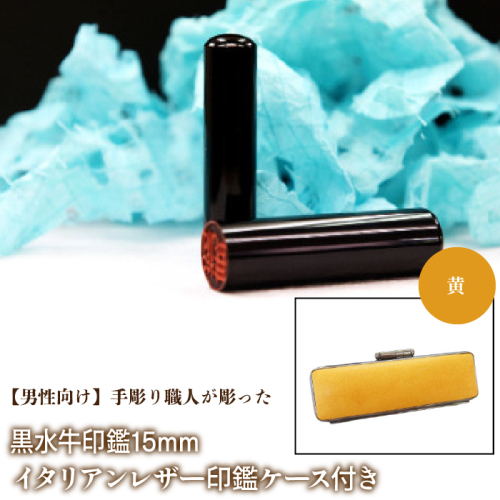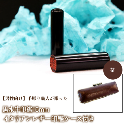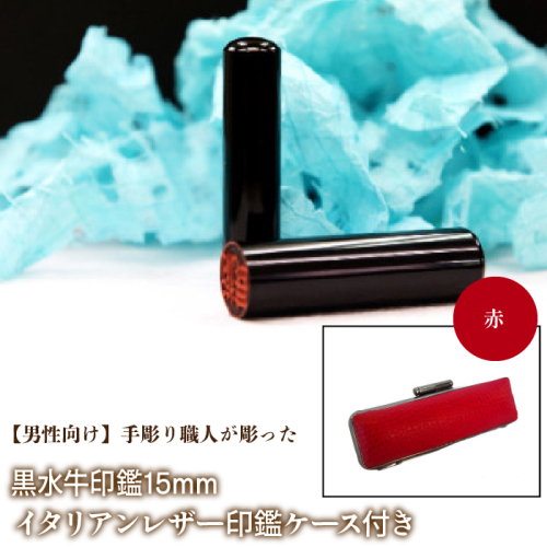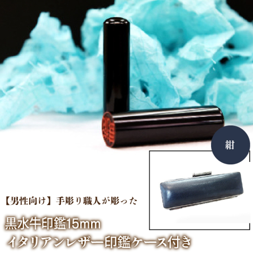 【男性向け】手彫り職人が彫った黒水牛印鑑15mm イタリアンレザ−印鑑ケース付き FCH013