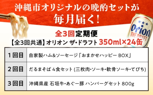 オリオンビール 晩酌セット 【全3回定期便】 沖縄市 TESIO だるまそば お肉屋本店 リカーショップ コザ [BCZZ036] ビール 酒 おつまみ 沖縄そば そば 石垣牛 あぐー豚 ハンバーグ はんばーぐ ハム ソーセージ はむ そーせーじ びーる 晩酌 オリオンビール ご当地 お酒 さけ オリオンビール 缶ビール 和牛 牛肉 豚肉 おきなわそば ソーキそば 定期便 3回 沖縄県 沖縄市