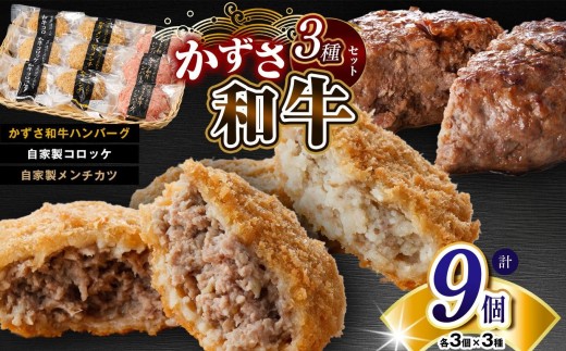 肉総菜 3種セット 詰合せ 各3個 合計9個(和牛コロッケ・和牛 メンチ・かずさ和牛 ハンバーグ) 国産 和牛 お肉屋さんの手作り| かずさ和牛工房 上総和牛メディアで紹介される人気店! ジャパンフードセレクション 金賞 肉専門店 牛肉 牛 肉 にく 国産 メンチカツ お惣菜 セット おつまみ 揚げ物 オススメ 千葉県 君津市 きみつ 【AKMKH-3】