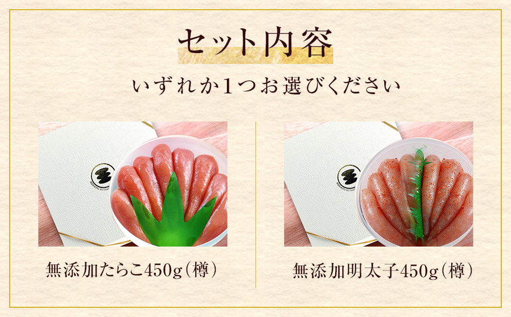 - 無添加 たらこ 明太子 450g樽コース 【選べる2種類】 鰹節と昆布の天然だし 手漬 手作り 贈答用 愛情たらこのみなと