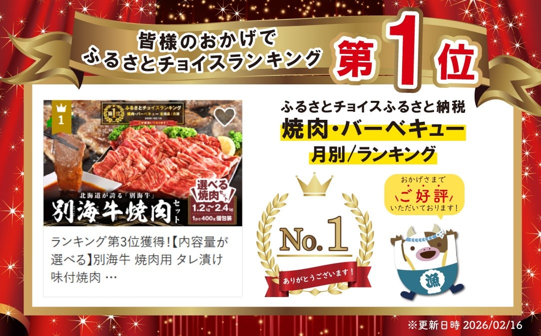 - 御礼!ランキング第1位獲得!【内容量が選べる】別海牛 焼肉用 タレ漬け 味付焼肉 1.2kg ~ 2.4kg 特製 焼肉用つけだれつき(肉 にく 牛肉 焼肉 国産牛肉 味付け牛肉 味付け牛焼肉 タレ漬け牛肉 特製焼肉 ふるさとチョイス ふるさと納税 仕組み キャンペーン 限度額 計算 ランキング やり方 シミュレーション チョイス チョイスマイル 大容量 焼肉)