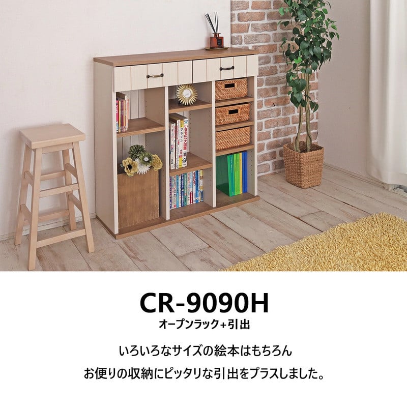 幅90cm カントリー風引出付き絵本棚 CR-9090H 【選べるカラー:ホワイト / ブラウン】 日本製 ≪寄付者様組み立て品≫ 【絵本ラック 絵本棚 書棚 オープン書棚 絵本 棚 稼働棚 移動棚 子供部屋 ラック オープン 木製 リビング収納 新生活 国産】 [H-18810]