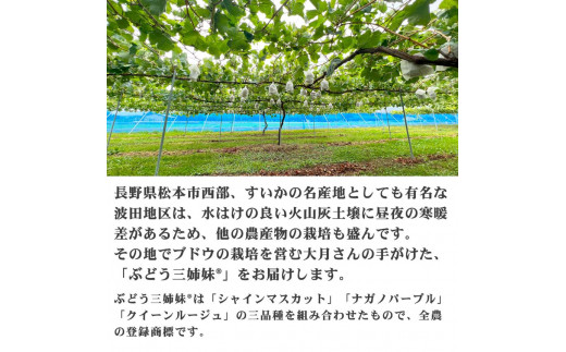 【先行受付】松本市波田産 贈答用 「ぶどう三姉妹」シャインマスカット・クイーンルージュ®・ナガノパープル 各500g以上 | ふるさと納税 長野県 松本市 信州産 フルーツ 果物 ぶどう 人気