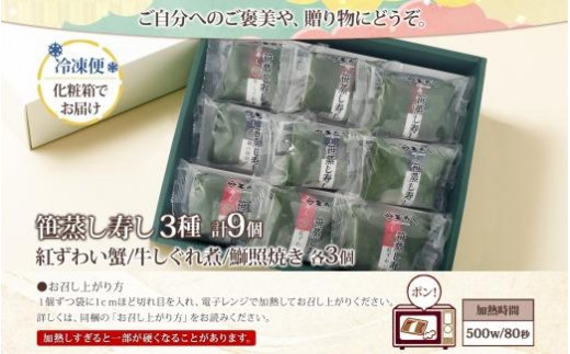 - 笹蒸寿し 3種 計9個 石川 金沢 加賀百万石 加賀 百万石 北陸 北陸復興 北陸支援 箱入り 紅ずわい蟹 牛しぐれ 鰤照焼 冷凍 寿司 個包装 グルメ スシ お取り寄せ すし 詰め合わせ ギフト 鮨 贅沢 蟹 押し寿司 お土産 芝寿し 送料無料 石川県 金沢市