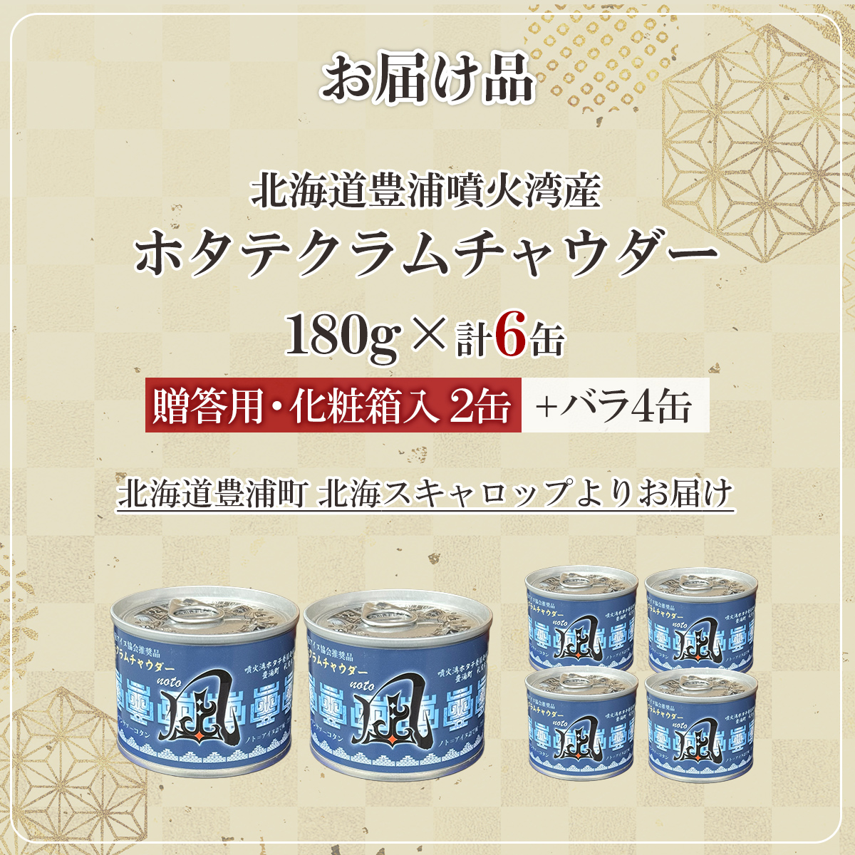 - 北海道 豊浦 噴火湾産 ホタテクラムチャウダー 180g×2缶【贈答用・化粧箱入り】+4缶 TYUAD034
