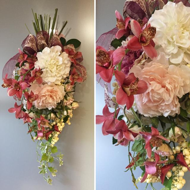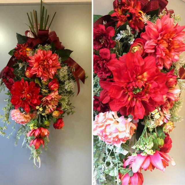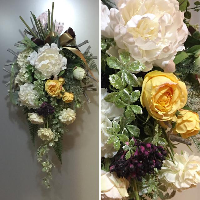 - フルオーダー 1点もの 壁掛けフラワーアレンジメント 造花 スワッグ【約長さ60㎝×幅30㎝×奥行20㎝】