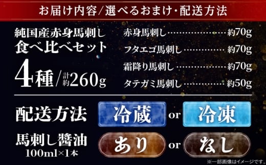 【冷凍 馬刺し専用醤油付き】純国産馬 馬刺し食べ比べセット計約260g 馬刺し専用醤油付き(赤身/約70g フタエゴ/約70g 霜降り/約70g タテガミ/約50g) / ばさし 馬刺 熊本馬刺し 熊本県 菊陽町【株式会社古閑ファーム】 [BHDF012]