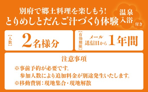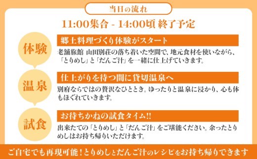 〈山田別荘〉別府で郷土料理を楽しもう!「とりめし」と「だんご汁」づくり体験(温泉入浴付き)