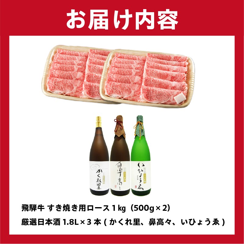 2-4 飛騨牛 すき焼き用ロース 1㎏(500g×2) + 厳選日本酒1.8L×3本【岐阜県 可児市 酒 日本酒 飲料 地酒 アルコール 手作り ギフト プレゼント お祝い 肉 牛肉 】