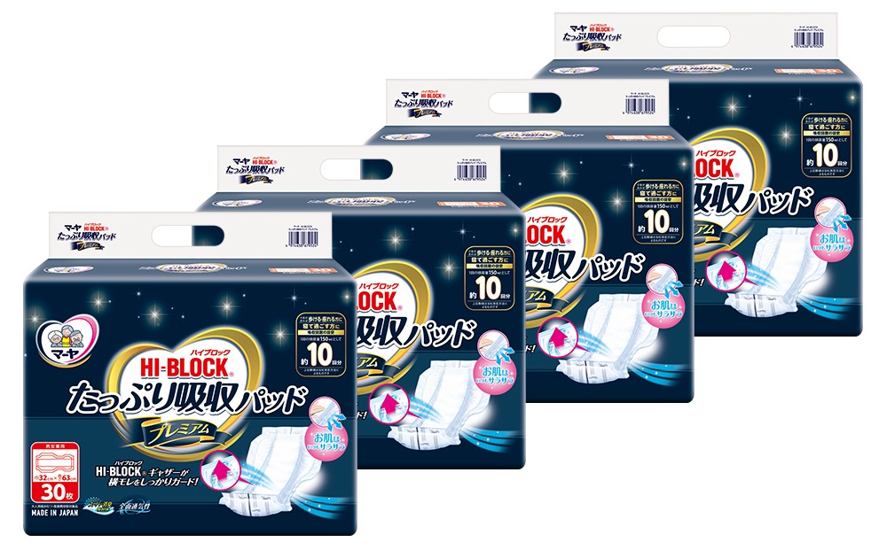 - マーヤ HI-BLOCK® たっぷり吸収パッド プレミアム (約10回分 / 大人用尿とりパッド / 通気性 ハイブロック) 紙おむつ 大人用 日用品 消耗品 4袋入り ケース