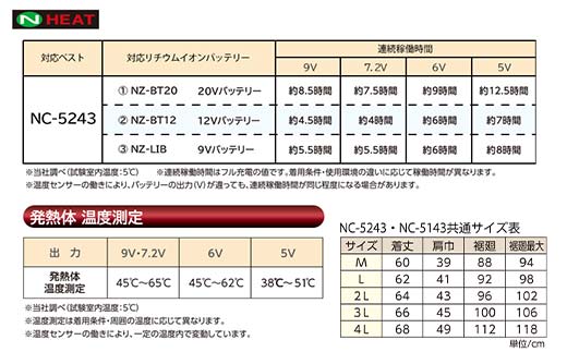 - \サイズが選べる/ Nヒート®ベスト(男女兼用) NC-5243発熱体内蔵式・9Vバッテリー充電器セット サイズL or 2L F4N-2702var