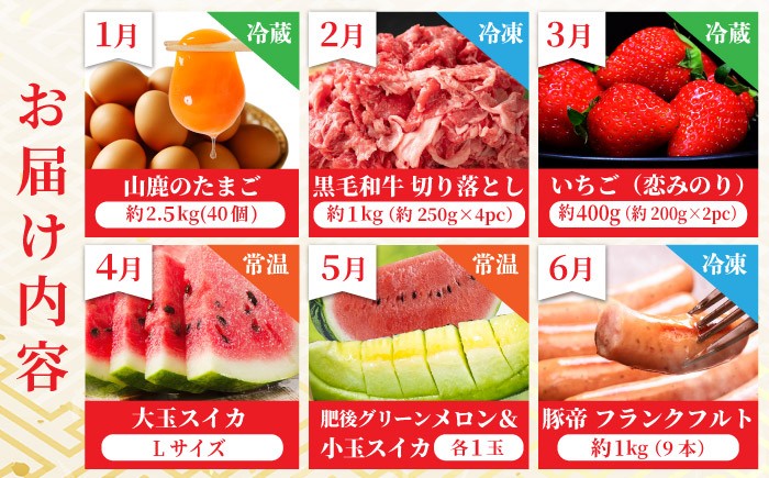 - 【12回定期便】 開けるたびワクワク!山鹿の極上福袋 お肉からあまいものまで山鹿の恵み 熊本 黒毛和牛 たまご いちご スイカ メロン 豚帝 フランク ジェラート ricca(リッカ)ピオーネ シャイン ぶどう 馬刺し ユッケ しゃぶしゃぶ サーロイン [ZZZ005]
