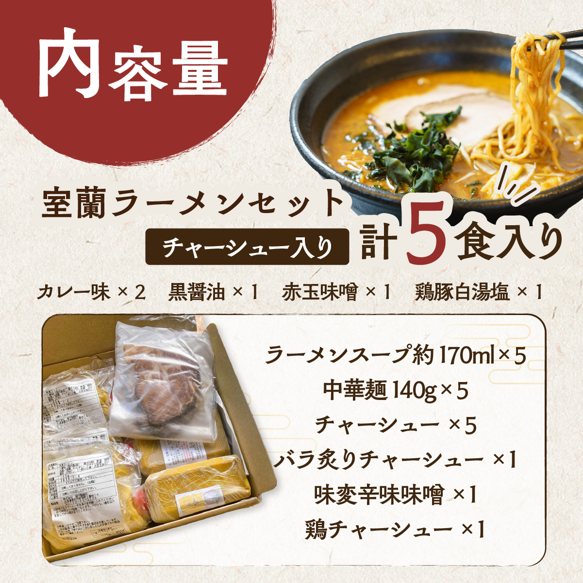 - 室蘭ラーメンセット(カレー味2、醤油、味噌、塩)5食セット道産小麦100%麺140g×5、自家製チャーシュー付き MROA161